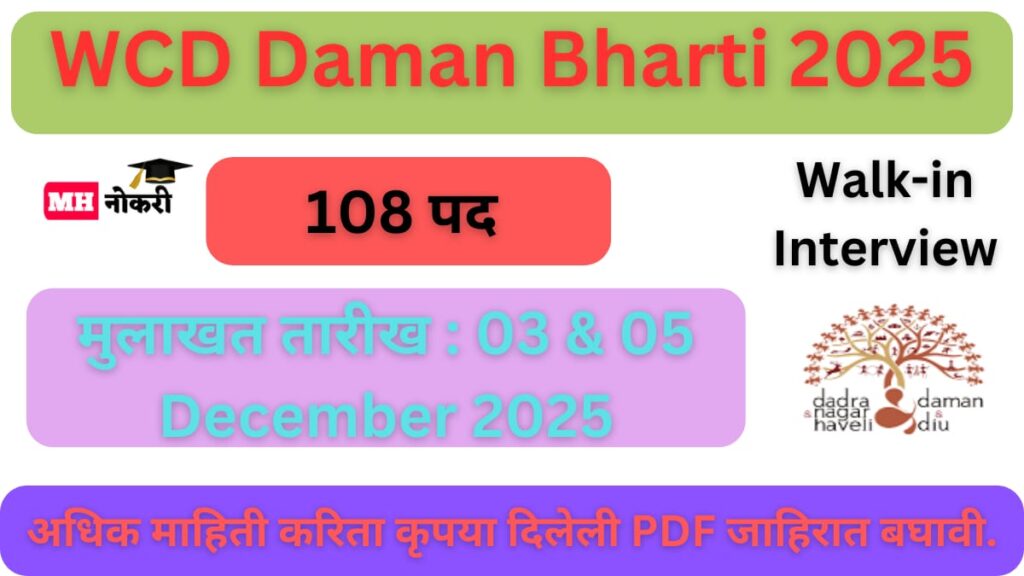 WCD Daman Bharti 2025 अंतर्गत Women & Child Development विभागाने DCPO, Programme Officer-SARA, Gender Specialist-SHEW, Centre Administrator-OSC, Legal cum Probation …