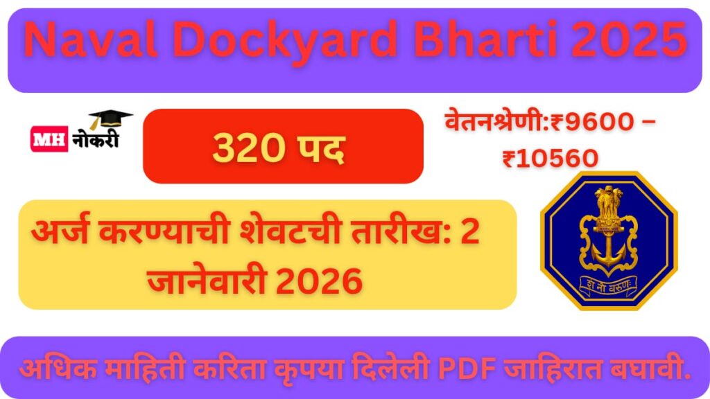 Naval Dockyard Bharti 2025 Premium Alert अंतर्गत विशाखापट्टणम येथे 320 Apprentice पदांसाठी भरती जाहीर करण्यात आली आहे. ही भरती शिकाऊ …