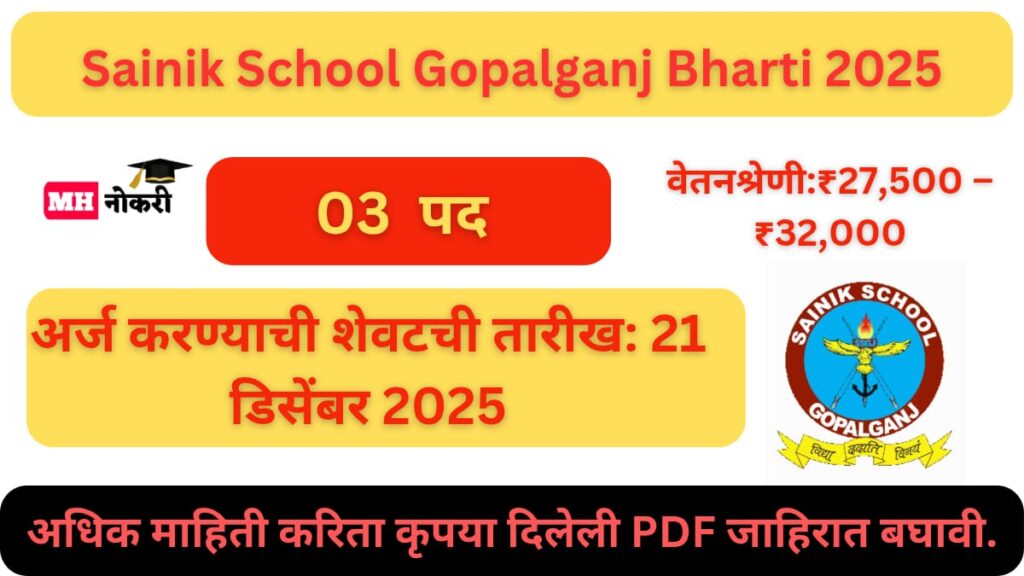 Sainik School Gopalganj Bharti 2025 ही Bihar मधील एक High Value Government Opportunity आहे. या भरतीअंतर्गत Librarian, Band Master आणि …