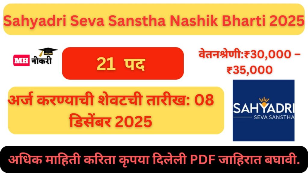 Sahyadri Seva Sanstha Nashik Bharti 2025 – 21 रिक्त पदांसाठी अर्ज सह्याद्री सेवा संस्था नाशिक अंतर्गत प्राचार्य, प्राध्यापक, सहयोगी प्राध्यापक, …