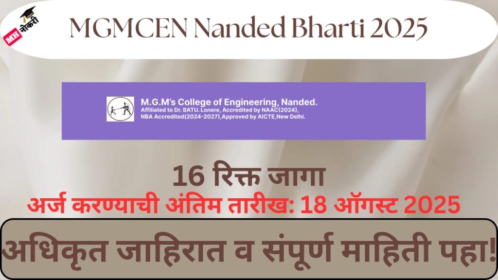 MGMCEN Nanded Bharti 2025 अंतर्गत महात्मा गांधी मिशन कॉलेज ऑफ इंजिनिअरिंग, नांदेड येथे विविध पदांसाठी भरती जाहीर झाली आहे. या …