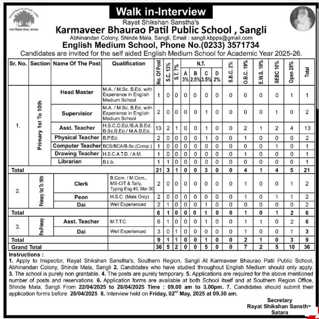 - मुलाखतीचे ठिकाण – कर्मवीर भाऊराव पाटील पब्लिक स्कूल, सांगली.